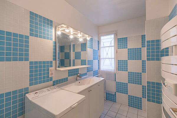El baño está equipado con mueble lavabo, lavadora y toallero calefactado.