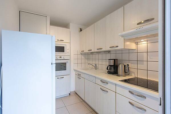 La cocina totalmente equipada incluye horno, lavavajillas, frigorífico con congelador, placa de cocción de 3 fuegos y campana extractora.