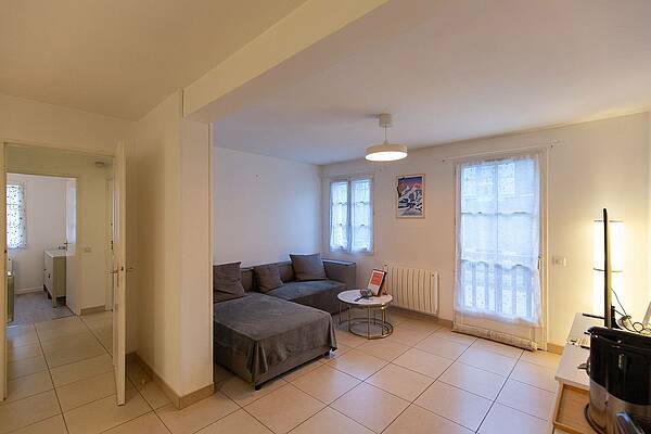 Apartamento de 60 m², compuesto por una agradable zona de estar con sofá en esquina y un televisor grande (105 cm).