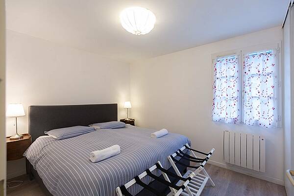 Un segundo dormitorio con dos camas individuales juntas (180 x 190 cm), también equipado con armario y barra para colgar ropa.