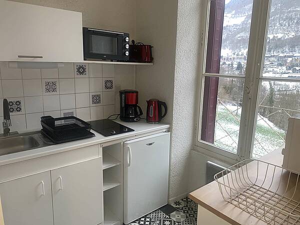 Descubra este apartamento de 41 m2 con capacidad para 6 personas, situado en la planta baja, cerca del centro de CAUTERETS, cerca de tiendas y restaurantes. Consta de una sala de estar con cocina equipada (microondas, horno y placa eléctrica, etc). Encontrará un altillo con cama 140 x 190, una zona de noche con una cama individual con cajón cama 90x190, así como una sala de estar equipada con un sofá-cama 140 x 190. El apartamento también tiene un baño con bañera zapot.