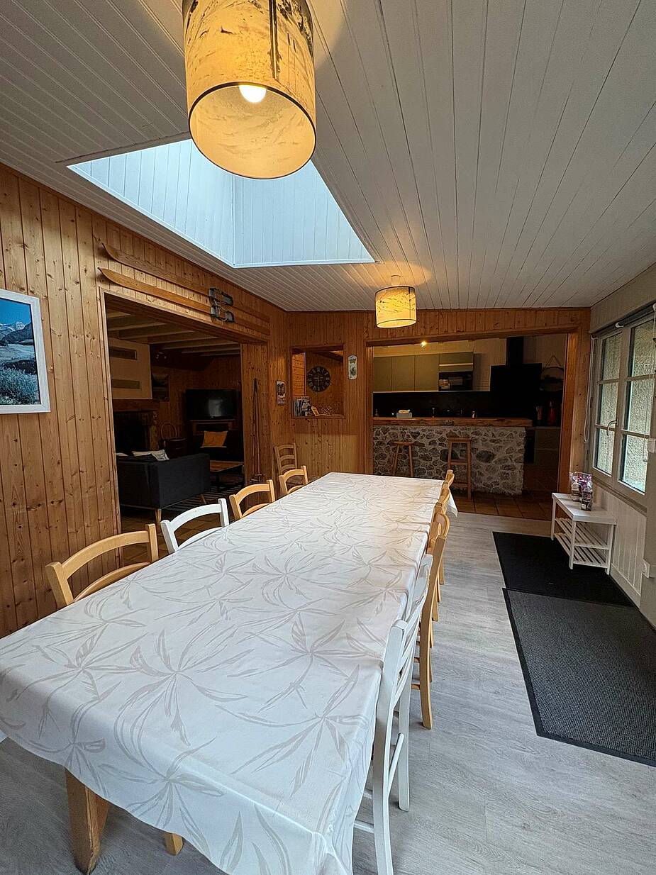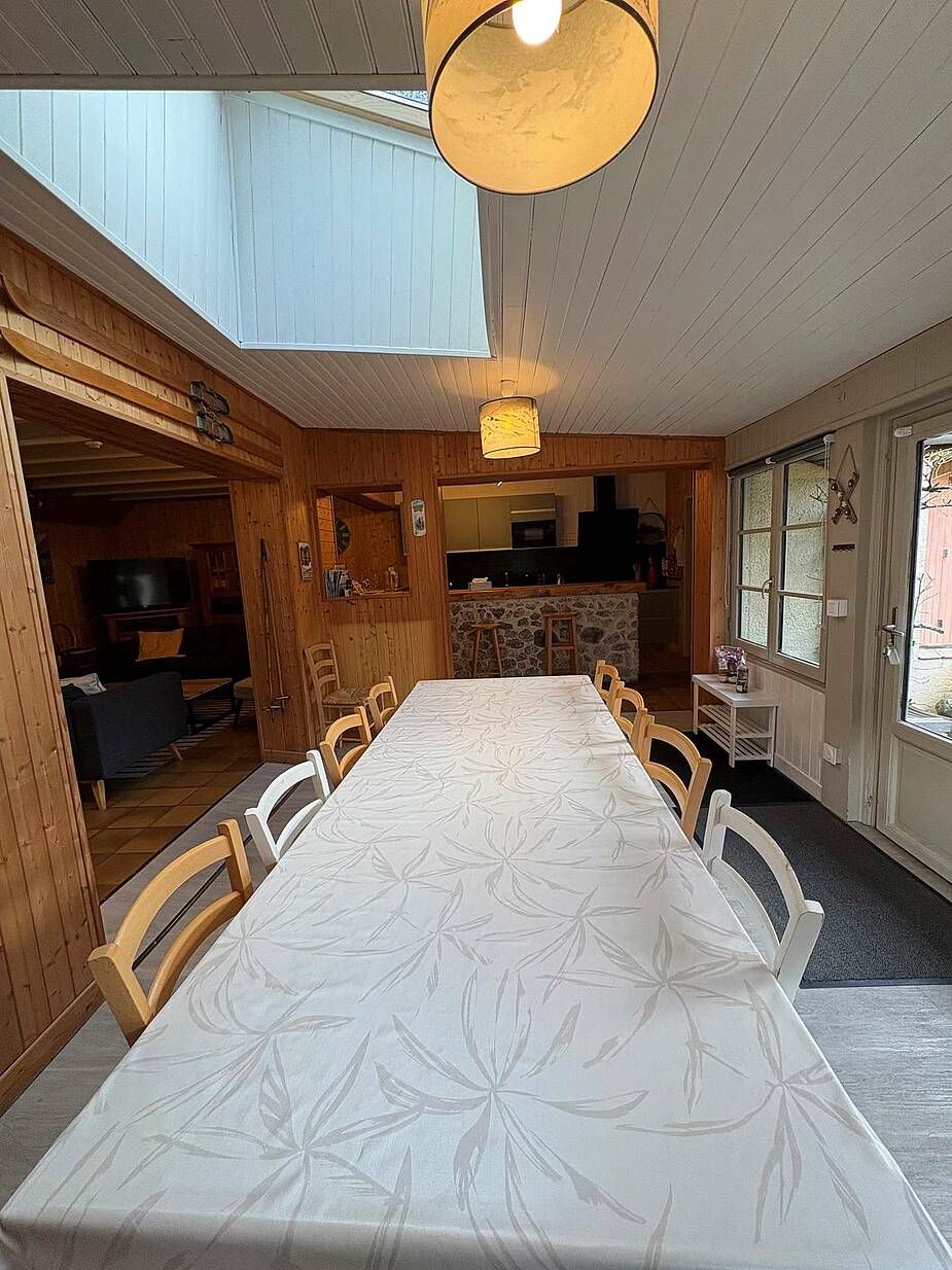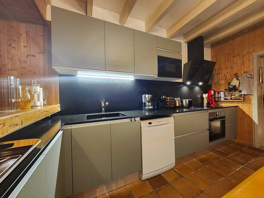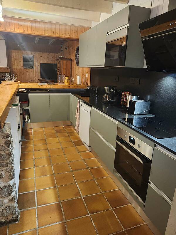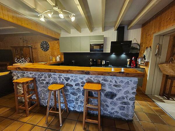 Cocina bien equipada con gran barra y encimera: horno, vitrocerámica, lavavajillas, microondas, cafetera de filtro y de cápsulas, tostadora, tetera, raclette.