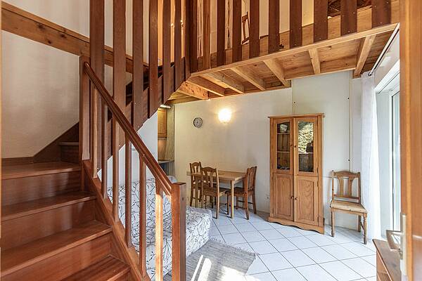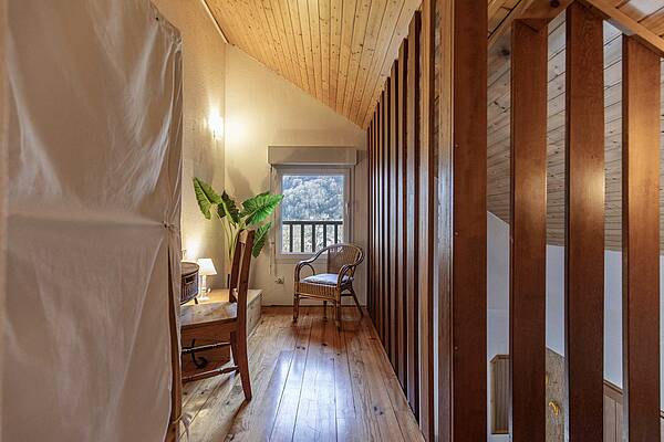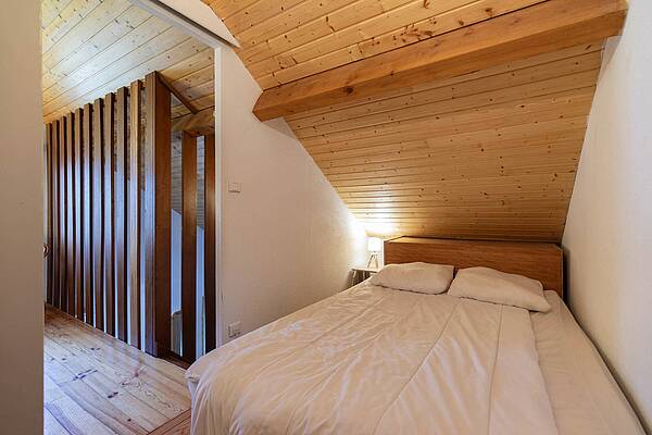 Arriba, un salón de relajación con un ventanal con una vista extraordinaria acogerá sus momentos de relajación, el dormitorio tiene una cama de 140 cm y espacio de almacenamiento.