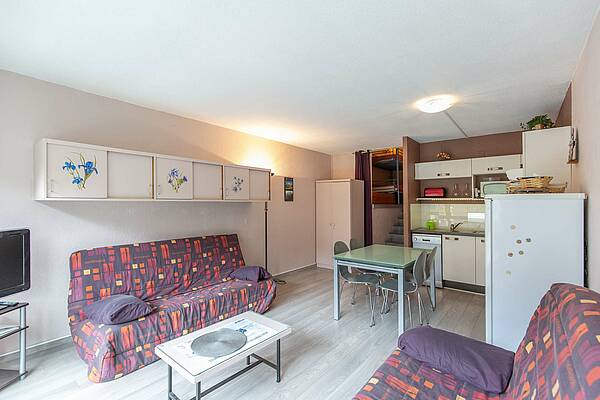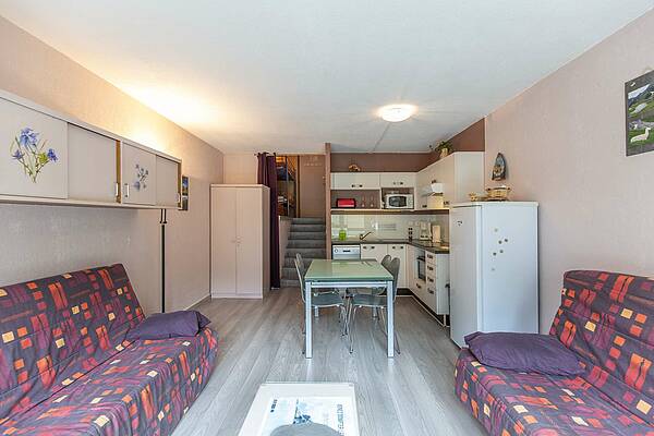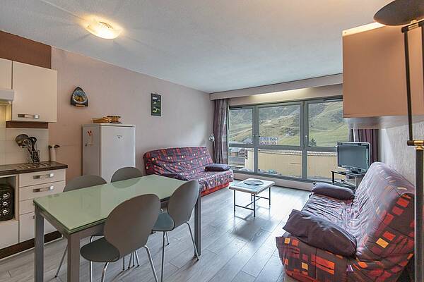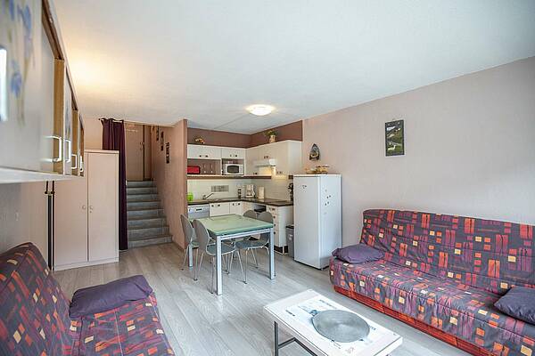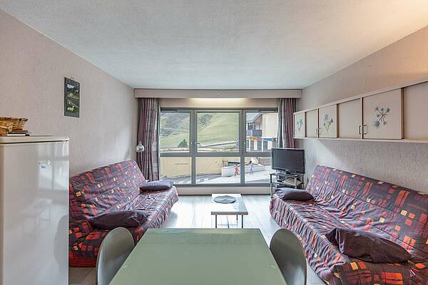 Situado en primera planta con ascensor, zona de 30 m2 sin balcón, exposición sur con vistas a las pistas y al complejo. Unos pasos hasta la sala de estar. Manténgase equipado: TV, reproductor de DVD, sofá cama para dos personas, zona de comedor y zona de cocina totalmente equipada (placas de inducción, horno, cafetera de filtro, microondas, lavavajillas, nevera 200 L, cafetera Senseo). Dos literas en 90 como entrante. Baño con ducha y aseo. Taquilla de esquí en DRC. El lineoleo del sol.