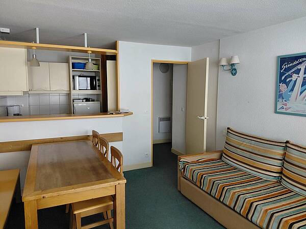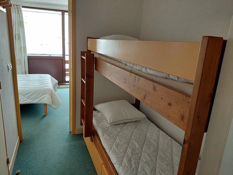 Apartamento situado en la zona de piso 7 de 35 metros cuadrados con balcón orientado al sur con vistas a las pistas. Manténgase equipado con una TV, un sofá cama, cabina con dos literas de entrada y una cámara con cama 140. Abrir la cocina al salón, con placa de inducción, microondas multifunción, lavavajillas, refrigerador 200 litros congelador, tostadora, hervidor y cafetera de filtro. Cuarto de baño que comprende bañera, lavabo. WC separado. moqueta. Local de esquí Emplacement aparcamiento cubierto bajo el edificio Nº 66 (1,80 m max alta).